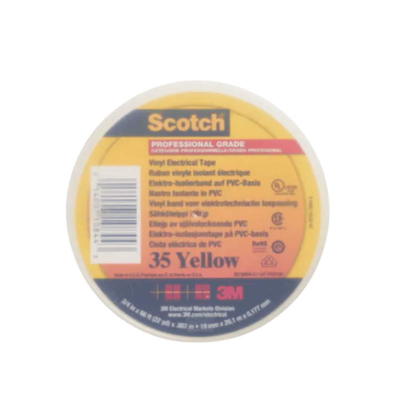 Use Scotch® 35 Vinyl Electrical Tape for phase identification, colour coding leads or piping systems, and marking safety areas. This professional-grade PVC tape protects electrical conductors, motor leads and piping from abrasion, acids, alkalis, corrosion, moisture and weather.