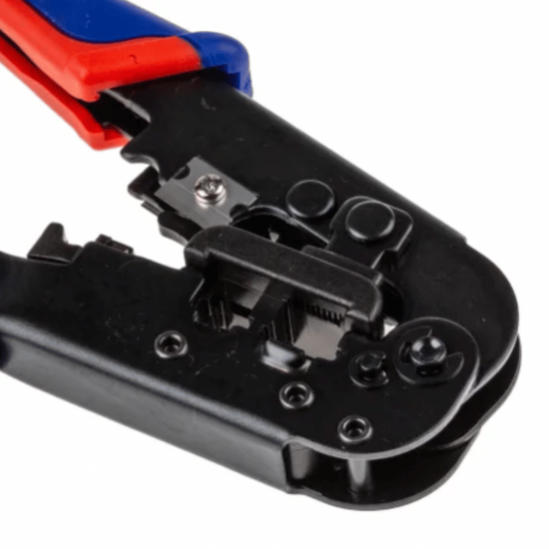 This crimping tool is designed to cut and strip unshielded flat / ribbon telephone cables and crimp RJ11 / 12 (6-pin) 9.65 mm and RJ45 (8-pin) 11.68 mm modular plugs with a parallel crimp. This crimper also automatically adjusts to the size of the ferrule to ensure precision work is done with every crimp. This feature saves the user the time of calculating the force when crimping, as the integrated lock in the crimping tool with release mechanism ensures that the correct amount of pressure automatically reaches the ferrule. These crimping pliers are equipped with multi-component handles, making them more comfortable and reducing fatigue.