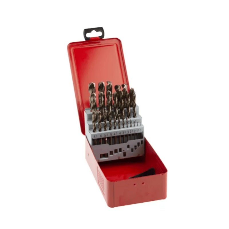A comprehensive 25 piece HSS-E Cobalt alloy high-performance drill bit set containing a great selection of the most commonly used diameters. Constructed from High-Speed Steel featuring a 5% cobalt content (HSS-E) enabling increased heat resistance.